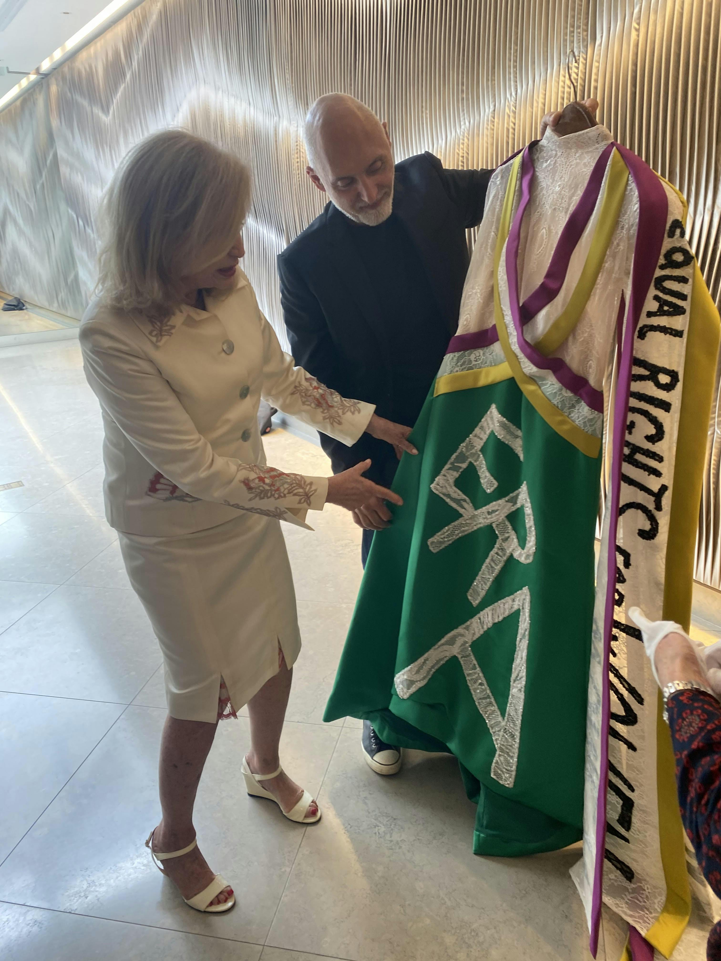 Representative Mahoney and Gassan Antonios with the ERA dress. Photograph courtesy of The Center for Women's History.