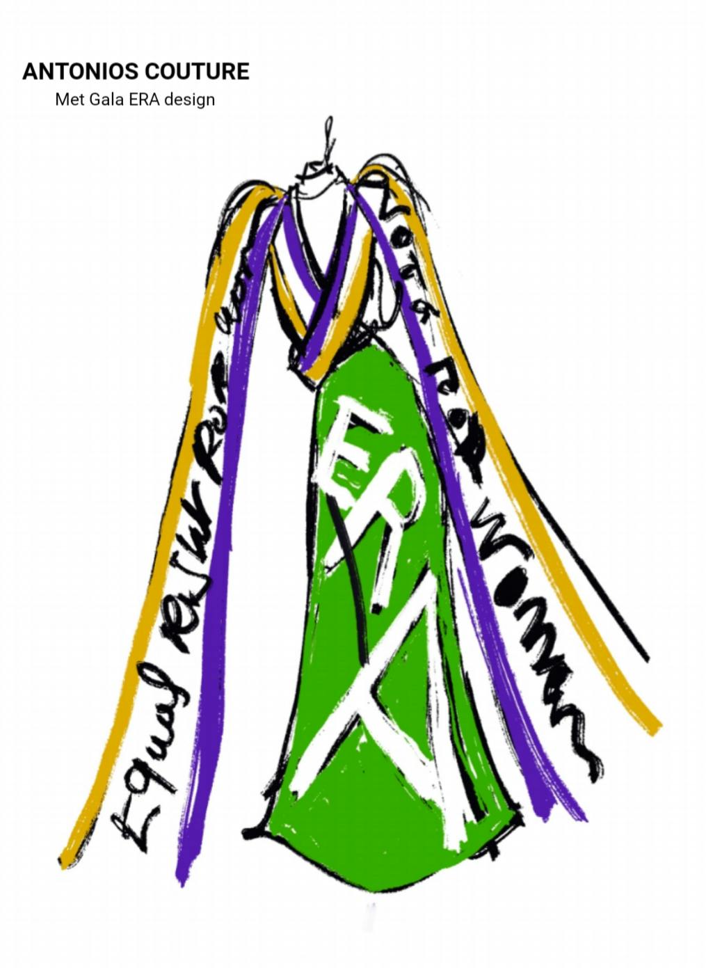 Fashion illustration by Gassan Antonios for the Met Gala, 2021. The letters ERA are made with white Chantilly laces attached with sequins and beaded embroidery to the green stain skirt, and the words Equal Rights for Women are made similarly made of black lace, hanging down from the shoulders in a way that echoes sashes worn by early 20th century Suffrage activists.