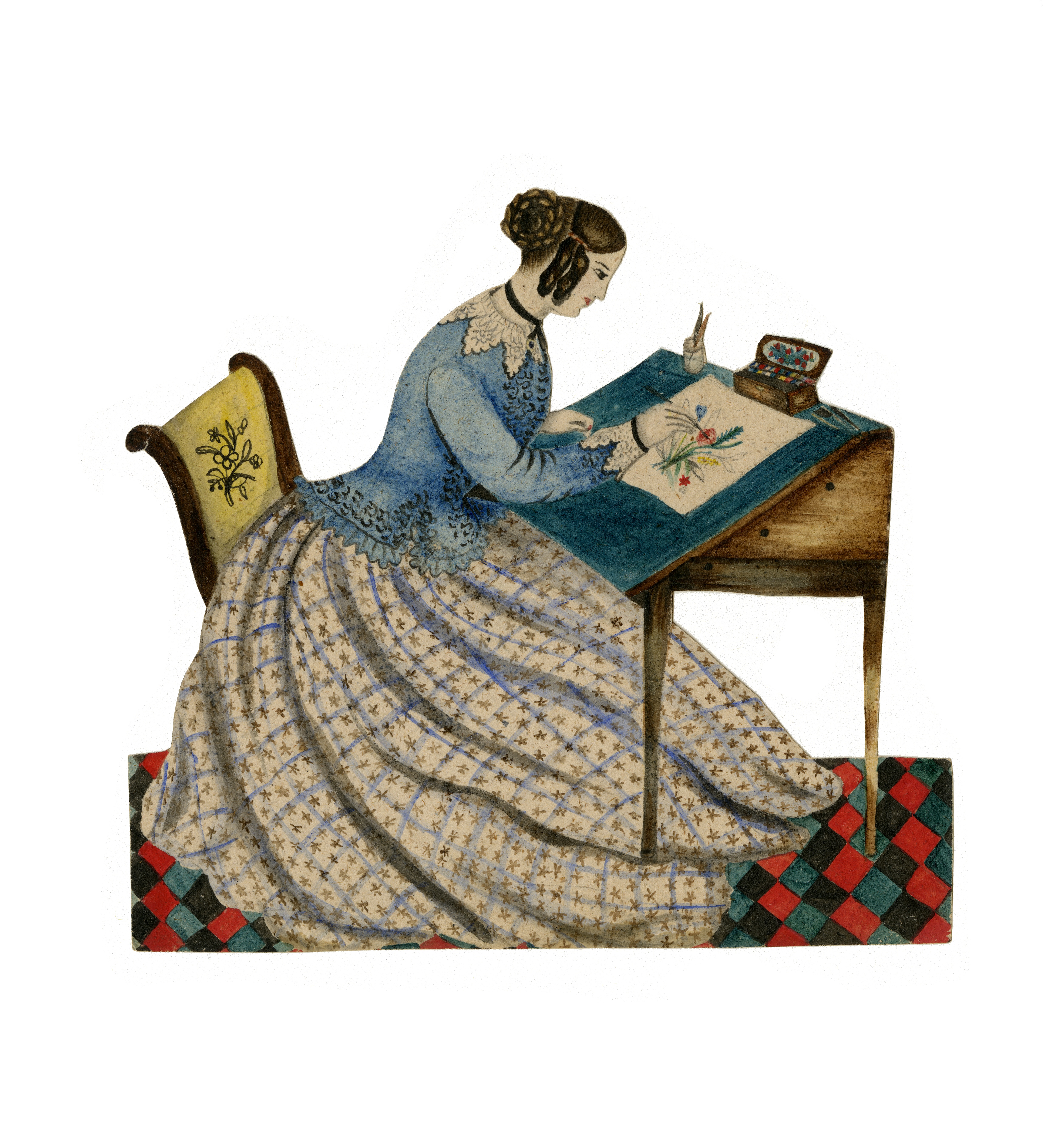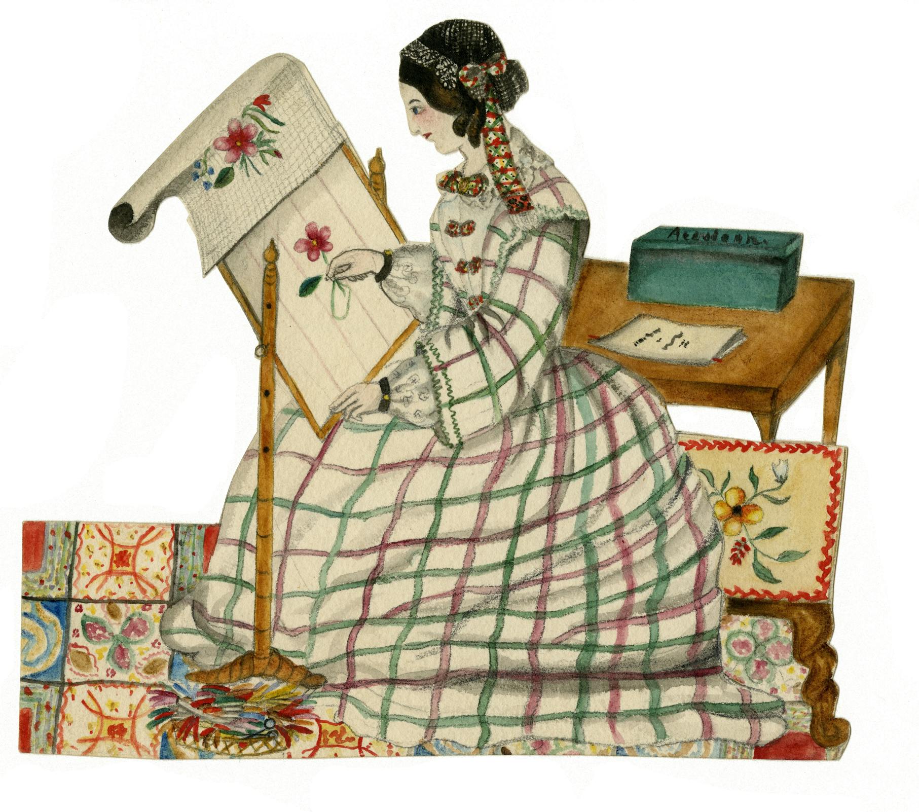This particular set of paper dolls also shows women engaged in art work, such as watercolor painting and needlepoint. These skills were part of elite girls' education, and many affluent women engaged in such pursuits in their leisure time. However, the mid- to late 19th century also saw a number of philanthropic efforts that aimed to help women translate their artistic skills for the marketplace by opening design schools for women, located in urban centers such as London, Philadelphia, Pittsburgh, New York, and Cincinnati. These schools offered professional training in the decorative arts for "deserving" women in need of "genteel" occupations.