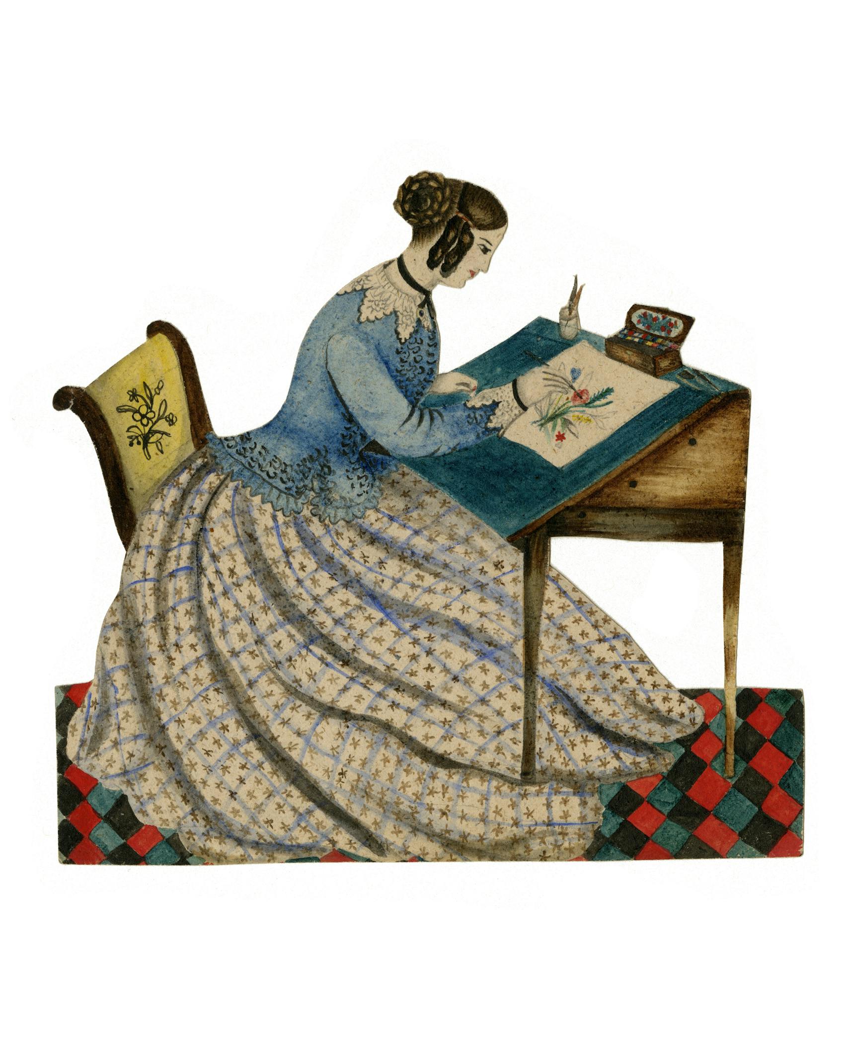 The 19th century's periodic financial panics, followed by the mass casualties of the Civil War, left thousands of American women widowed or unmarried. These economically vulnerable women needed work that would allow them to financially support themselves, but could ideally be “practiced at home, without materially interfering with the routine of domestic duty,” as Sarah Peter, founder of the Philadelphia Design School for Women put it. Students at these schools trained as commercial artists, art teachers, engravers, and designers of “china and silver, carpets, chintz curtains, wall papers, oil-cloths and upholstery, dress fabrics and trimmings, illustrated books,” and all sorts of home goods. In the September 1852 issue of the popular magazine Godey's Lady's Book, author Alice B. Neal asserted that such design work, despite being “a business entirely monopolized by men,” was actually “better suited" for women, because it “demands little physical strength, but the most delicate manipulations."