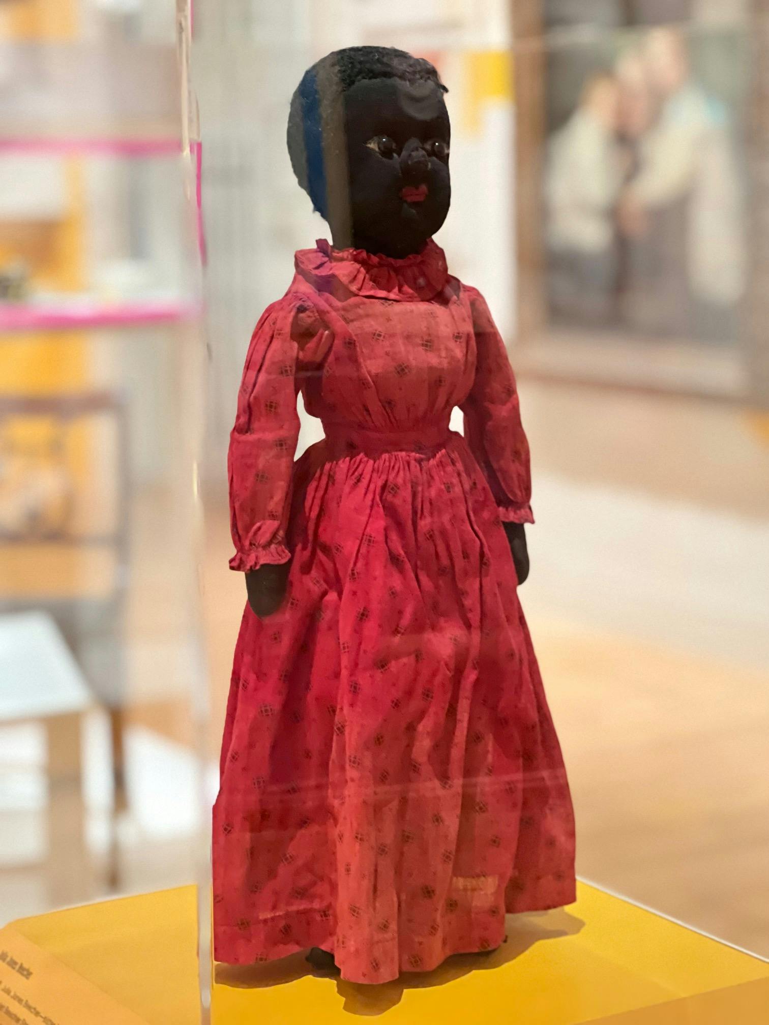 In 1893, Julia Jones Beecher—sister-in-law to Uncle Tom's Cabin author Harriet Beecher Stowe—began upcycling used stockings to create dolls characterized by a prominent brow, painted eyes, and curly yarn hair. These "Beecher-type" dolls were sold via mail-order and at charitable functions nationwide to raise money for missionary work sponsored by the Independent Congregational Church of Elmira, New York, where Beecher's husband served as the minister. While "Beecher-type" dolls made out of white stockings depicted babies, the dolls made out of black stockings, like the one above, portrayed adult women who were usually equipped with aprons. This reflected the widespread caricature of Black women as subservient “mammy” figures, always ready to perform domestic work in white households: cooking, cleaning, and caring for white children.