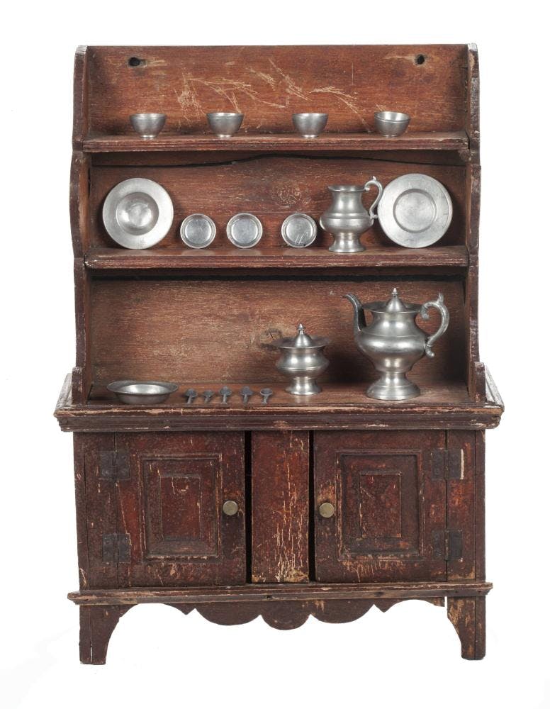 Unidentified maker. Toy cupboard with pewter dishes, 1850–1900. Wood, brass, pewter. The New York Historical, Gift of Katharine Prentis Murphy, 1961.35a-s