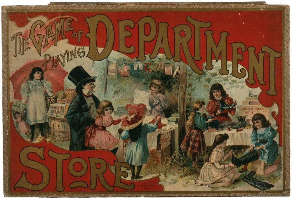This game introduced children to department stores: luxurious emporiums carrying all sorts of goods and catering to fashionable, middle-class women who enjoyed shopping, dining, and socializing in a safe, genteel environment. By the late 1800s, shopping was considered such a gendered activity that New York City's retail district was popularly known as "The Ladies' Mile."