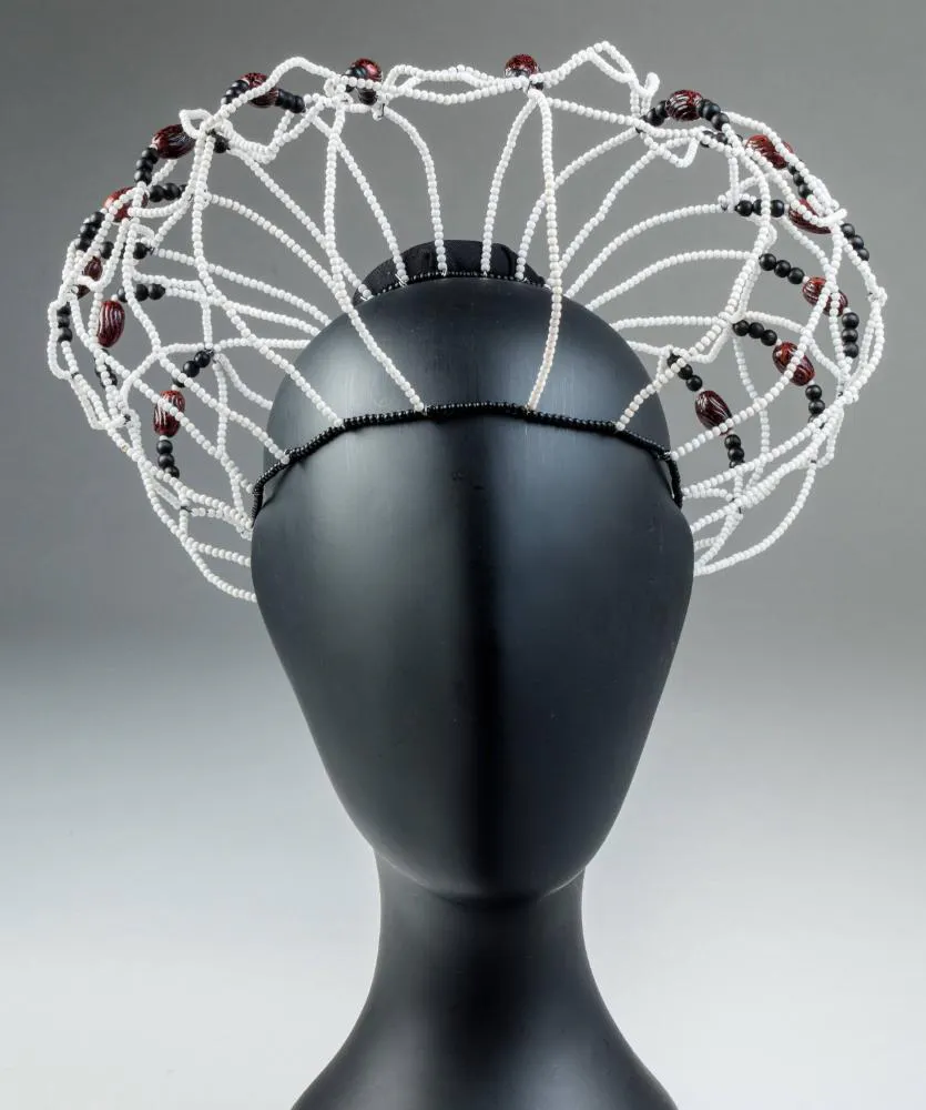 Right: Carolee Prince (active ca. 1955–1970), artist. Beaded headdress, 1964. Beads, wood, string, leather. The New York Historical Purchase, Satloff Decorative Arts Fund, 2024.17