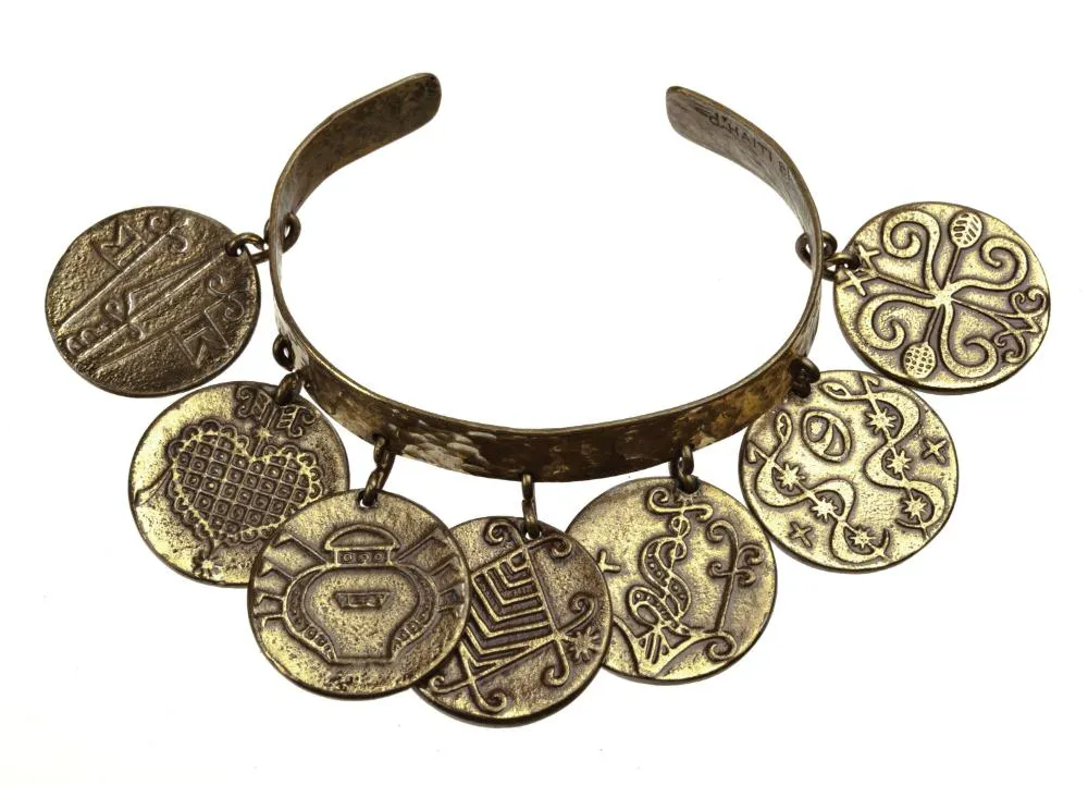 Winifred Mason Chenet, the first known African American professional jewelry designer, created a line of Vodou-inspired jewelry which incorporated Haitian folk and Vodou symbols. The pendant came from Chenet’s Vodou d’Haiti line, and probably depicts Damballah, a Vodou deity known as the god of all spirits. The line, renamed Chenet d’Haiti once the jeweler began selling to Bloomingdale's, also included this bracelet. The charms are Vodou vevets—emblems representing saints that are ceremonially drawn on the ground with powdered chalk, as in the image below.