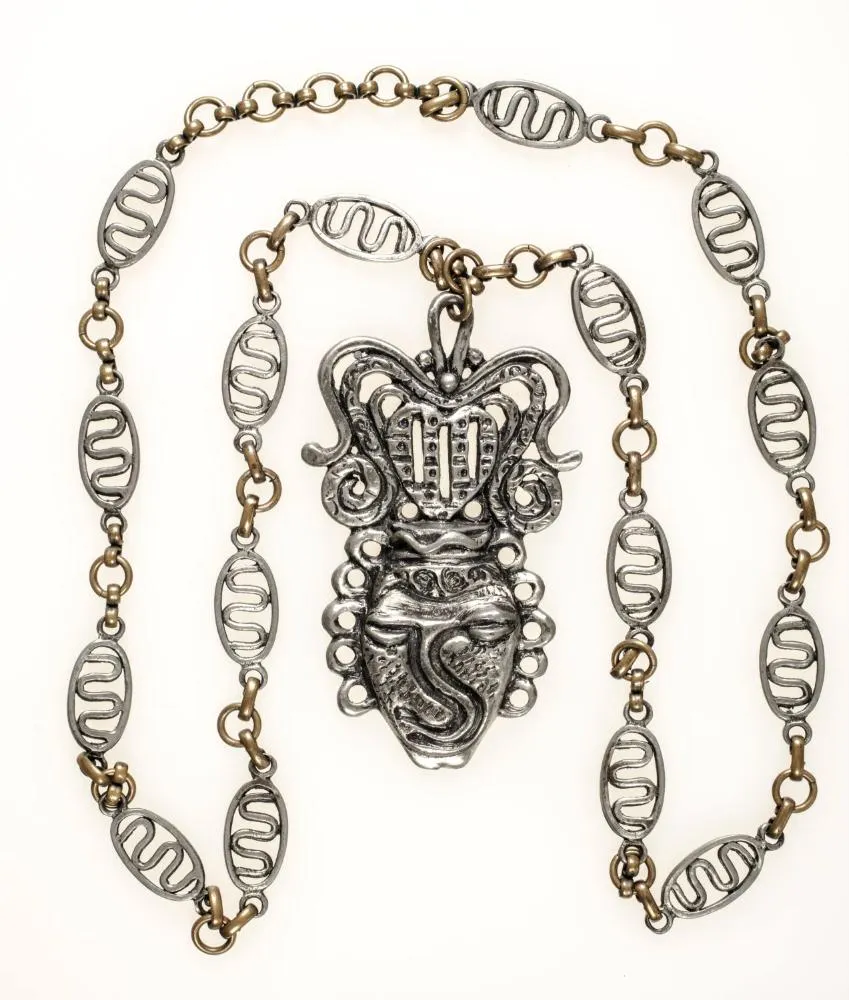 Left: Winifred Mason Chenet (1912–1993), artist. Pendant, 1951–1963. Mixed metals, possibly copper or brass, and pewter. The New York Historical, Gift of Rebecca Klassen, 2024.21