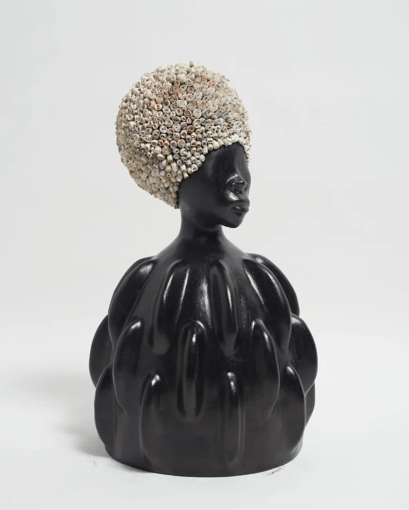 Left: Simone Leigh (b. 1968), artist. Basse Terre, 2017. Fired clay, porcelain, resin, India ink. The New York Historical, Purchased through the generosity of Pamela and Arthur Sanders, Pam and Scott Schafler, 2017.74