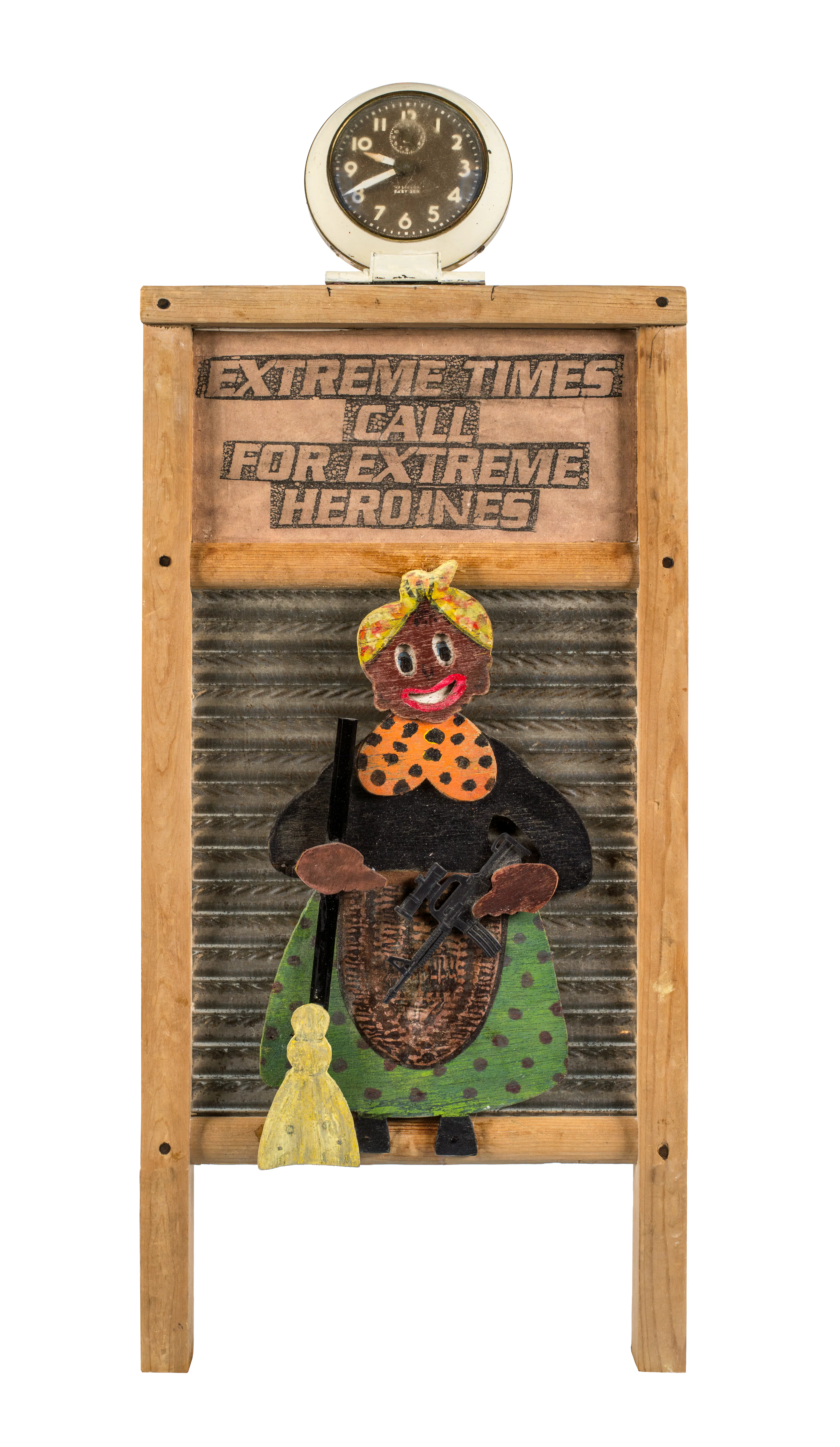 Betye Saar (b. 1926), artist. Extreme Times Call for Extreme Heroines, 2017. Mixed media and wood figure on vintage washboard, clock. The New York Historical, Purchased through the generosity of Louise Mirrer; Ernest Tollerson and Katrinka Leefmans; Pam and Scott Schafler; Marilynn Gelfman Karp; Margi and Andrew Hofer; Linda S. Ferber; Frances Ann Schulman; Nicole, Nathan, and Brian Wagner; an anonymous donor; and members of the Frederick Douglass Council. Additional support provided through the Women Artists Fund in memory of Mildred Mirrer, 2019.76