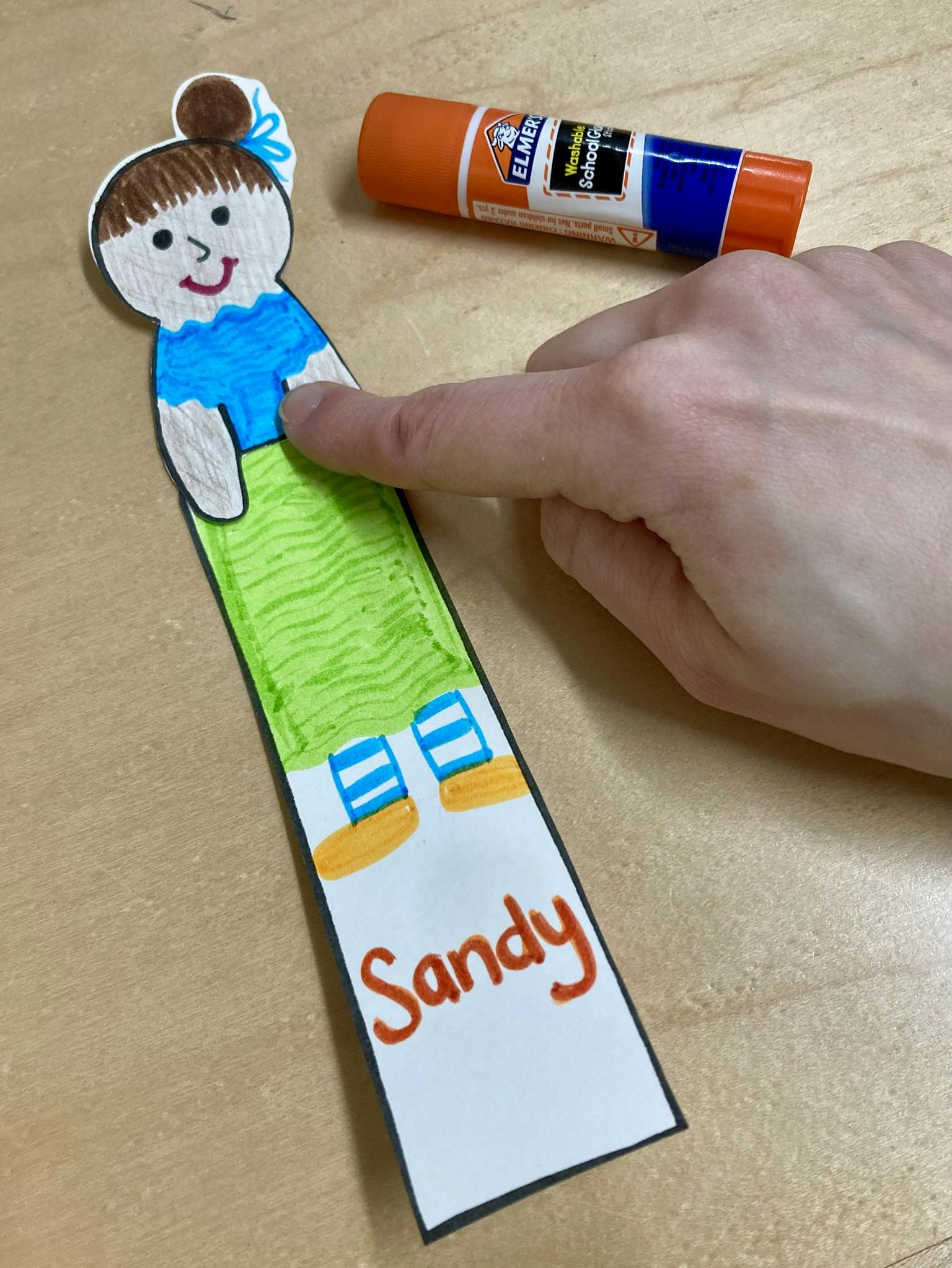 Use your glue stick to put them together. Spread glue over the bottom of your bookmark character’s head and body. Make sure not to put glue on the arms! Like this: