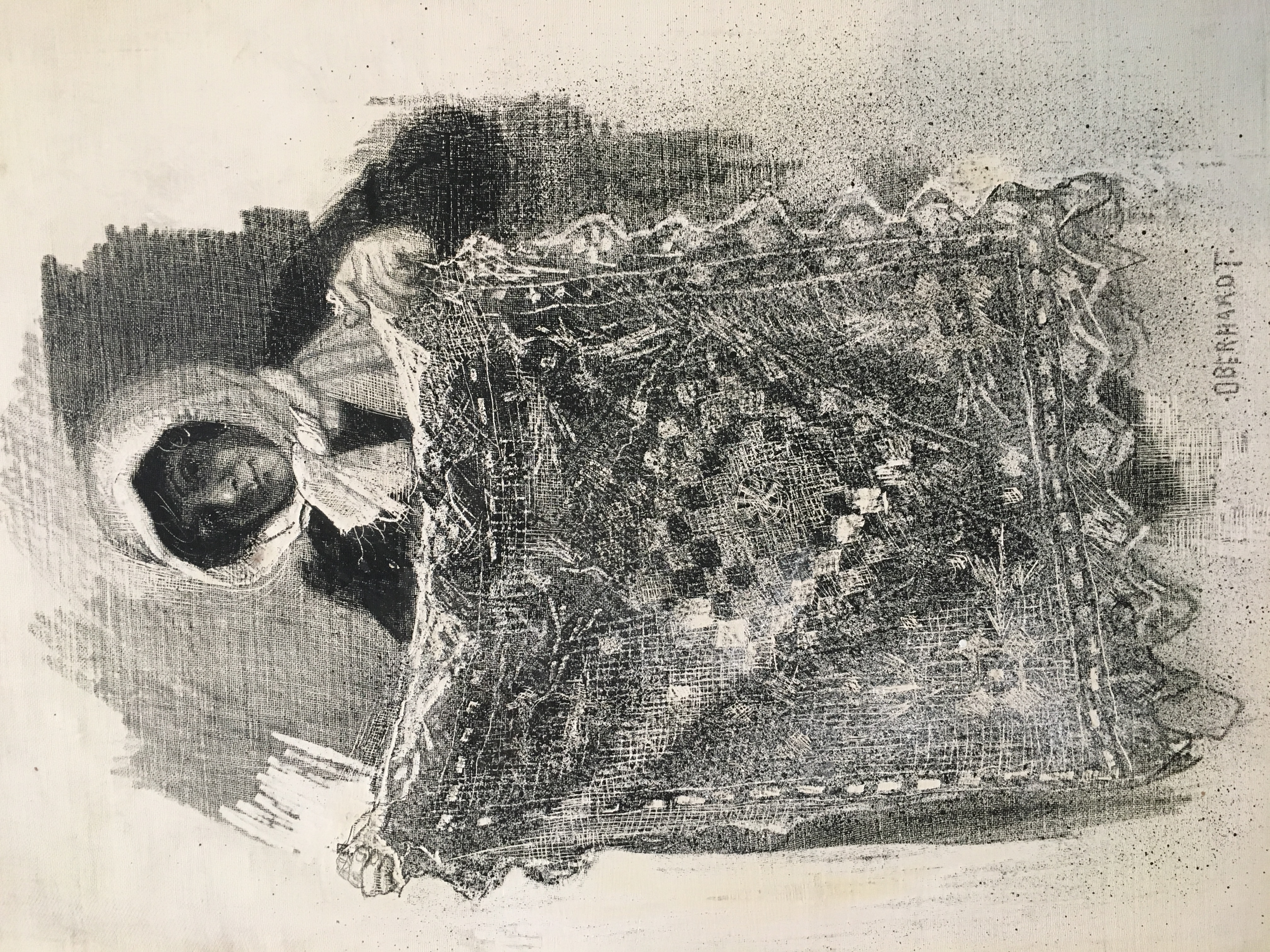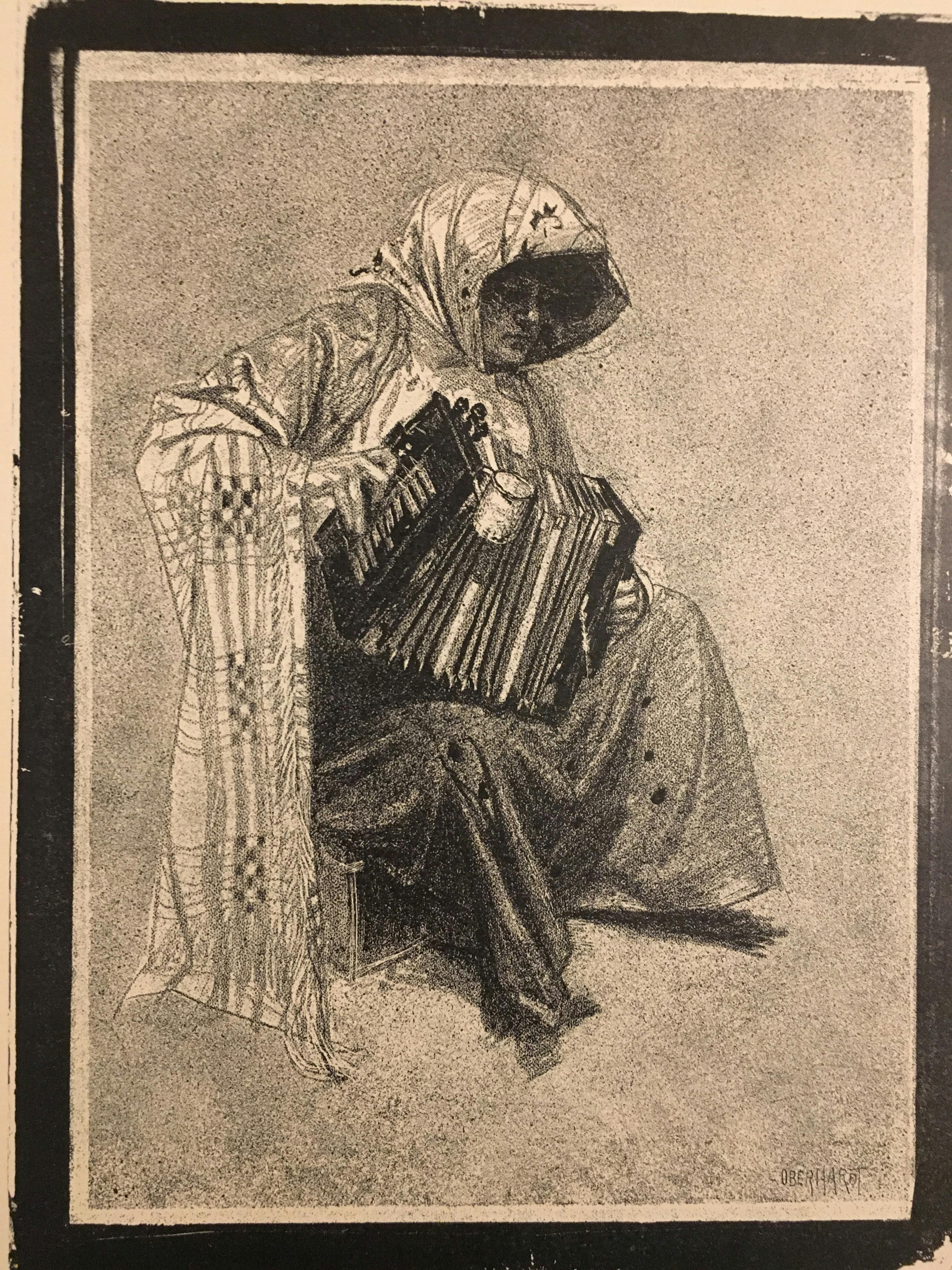 William Oberhardt (1882–1958), artist. Portrait of Zoe Anderson Norris (1860-1914) disguised as a street musician, 1910. Lithograph. Patricia D. Klingenstein Library, The New York Historical. Photo courtesy Eve M. Kahn.