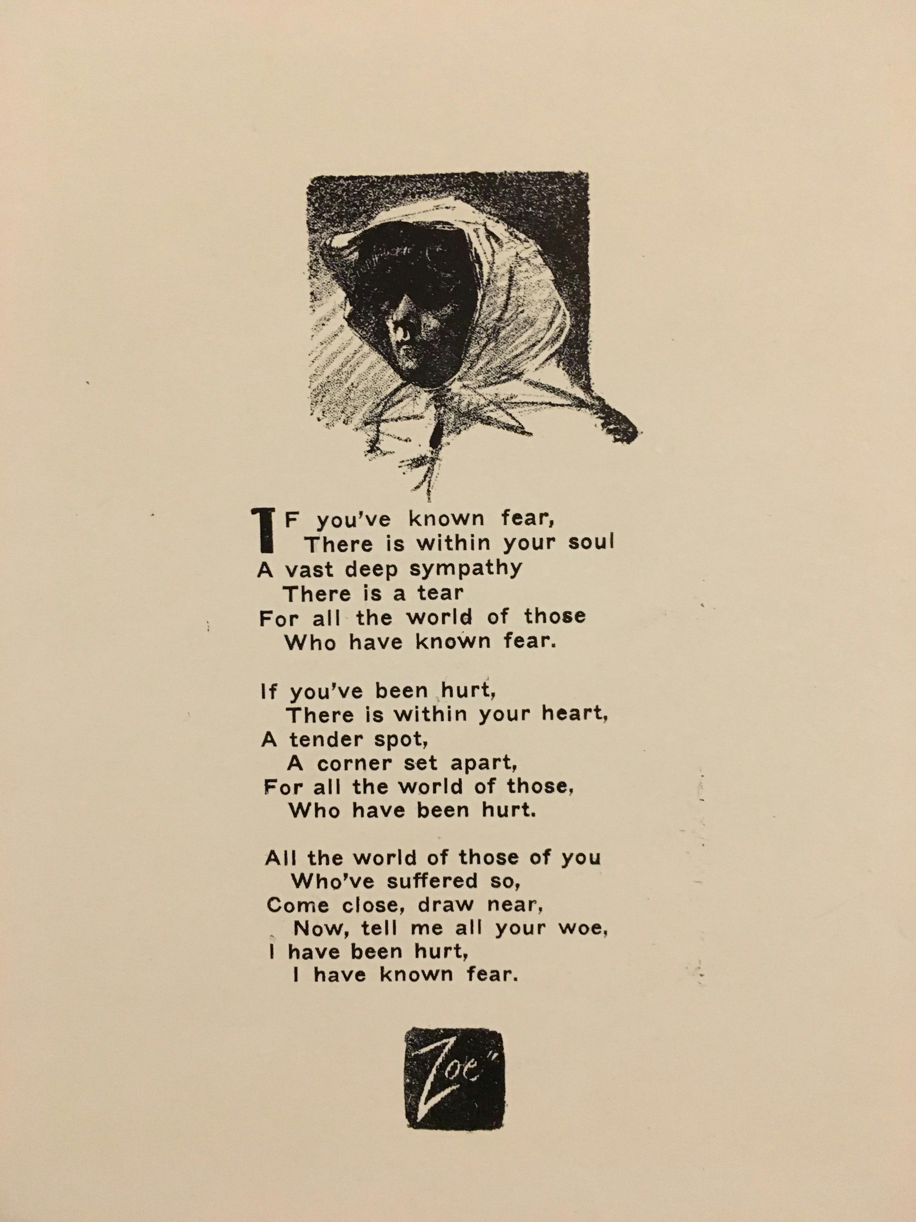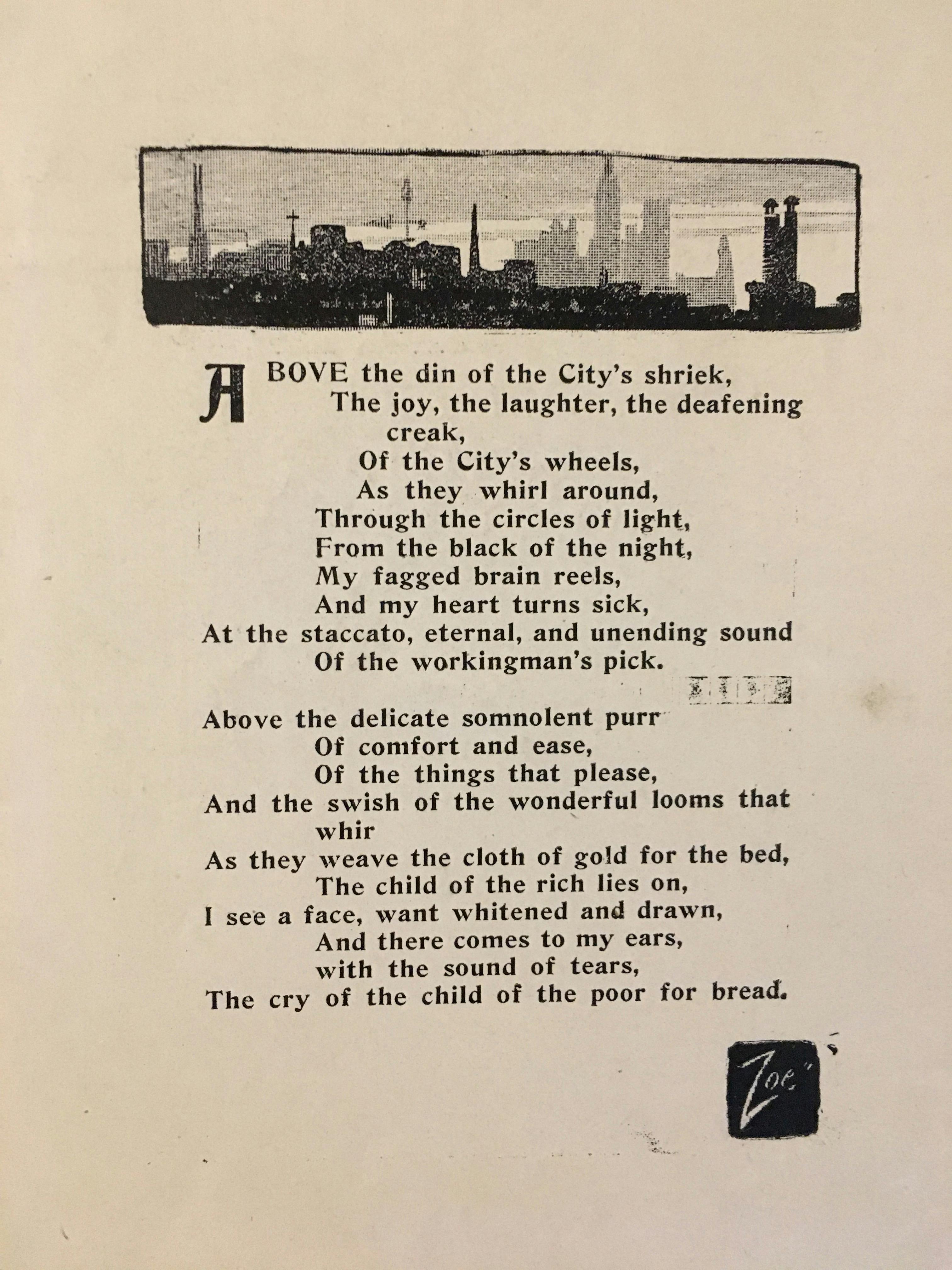 Left: Zoe Anderson Norris (1860–1914), author. William Oberhardt (1882–1958), artist and lithographer. Poem from The East Side magazine, back cover, summer 1910.