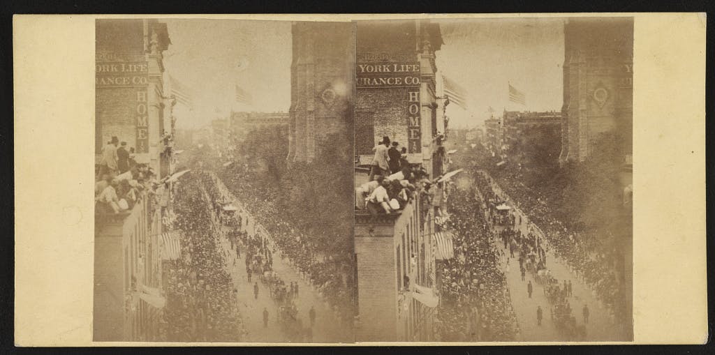 "After dinner I left the store and went down to Broadway and Battery. Broadway alone was a sight to behold. One would think that all New York was in the street, for it was crowded to excess, and a person going either way had hard work to get along. The windows of the different hotels and stores presented a beautiful sight never to be forgotten. Each window was filled to the utmost with ladies and children, while the window-sills and awnings were covered with men and boys. The lamp-posts, trees, stoops, and other things of like description were seized upon by young and old."