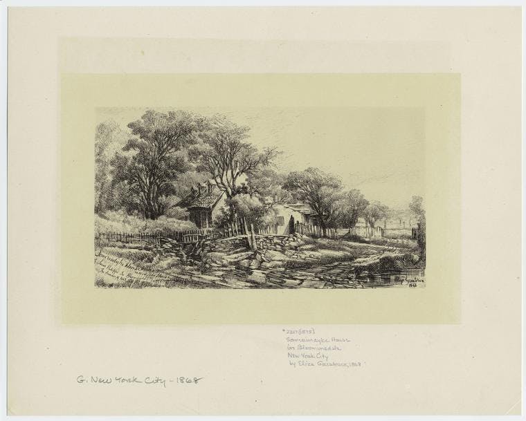 An etching of the Somerindyke House in Bloomingdale, New York City in the summer of 1868 by Eliza Greatorex. The Miriam and Ira D. Wallach Division of Art, Prints and Photographs: Picture Collection, The New York Public Library.