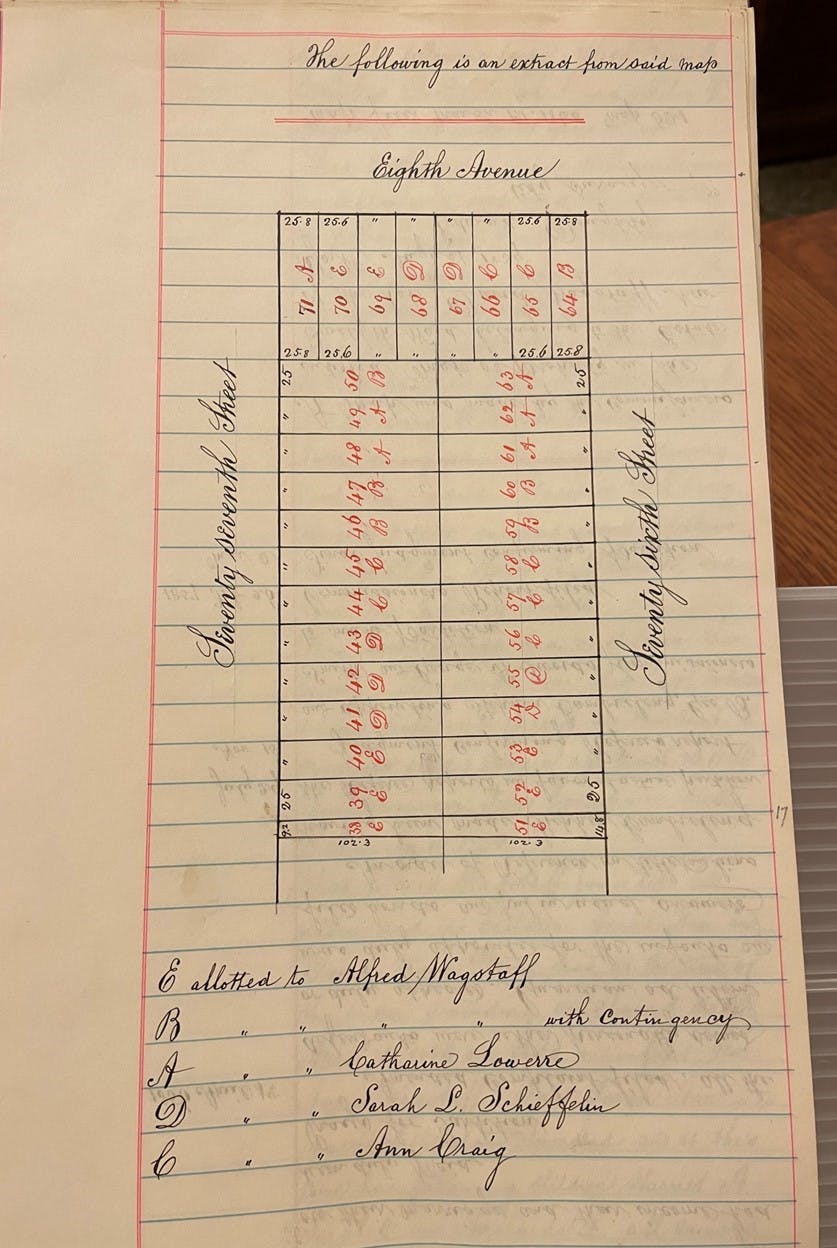 Map of the Wagstaff property deeded to his children. New-York Historical Society original buildings planning & construction records, Series III. Central Park West Construction: Central Portion, 1880-1918, Abstract of the Title of N-YHS to Ten Lots of Land in the City of New York, August 19, 1891, RG 3 Box 5.
