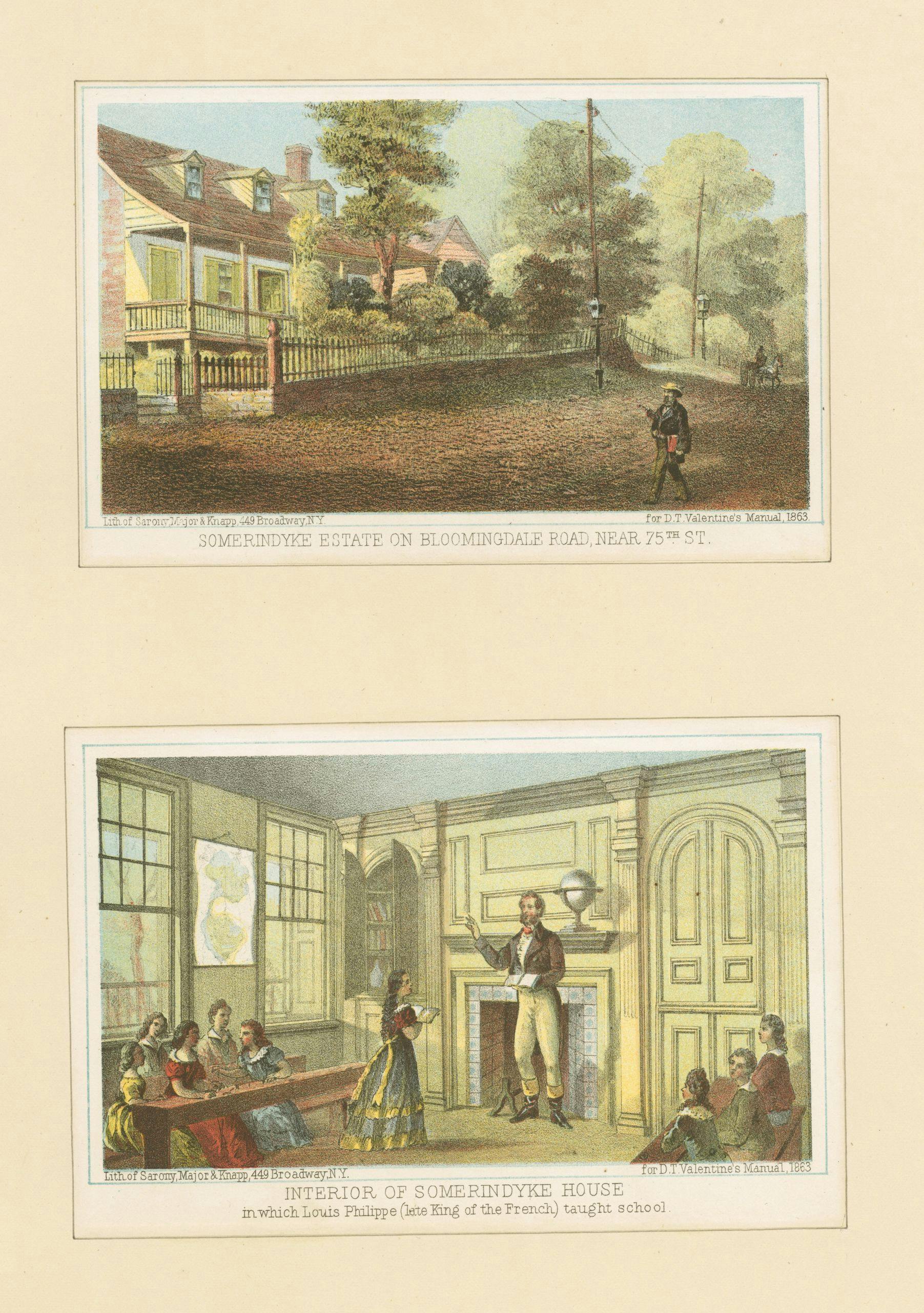 "Somerindyke estate on Bloomingdale Road, near 75th St" (top) and "Interior of Somerindyke House, in which Louis Philippe (late king of the French) taught school" (bottom). Lithograph published by Sarony, Major, and Knapp, 1863. The Miriam and Ira D. Wallach Division of Art, Prints and Photographs: Print Collection, The New York Public Library.