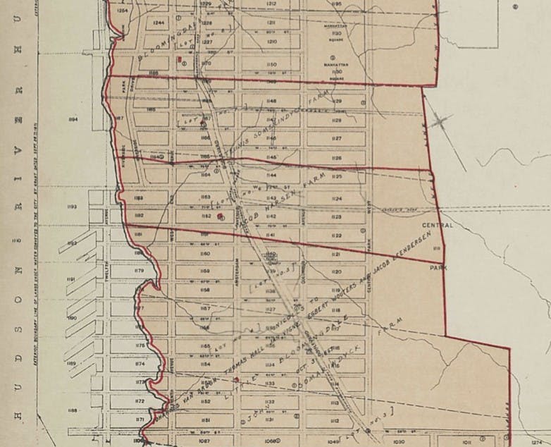 Cadastral map of the area later bounded by 56th and 78th Streets, 7th Avenue or Central Park, and the Hudson River, Manhattan, New York, N.Y. New-York Historical Society.