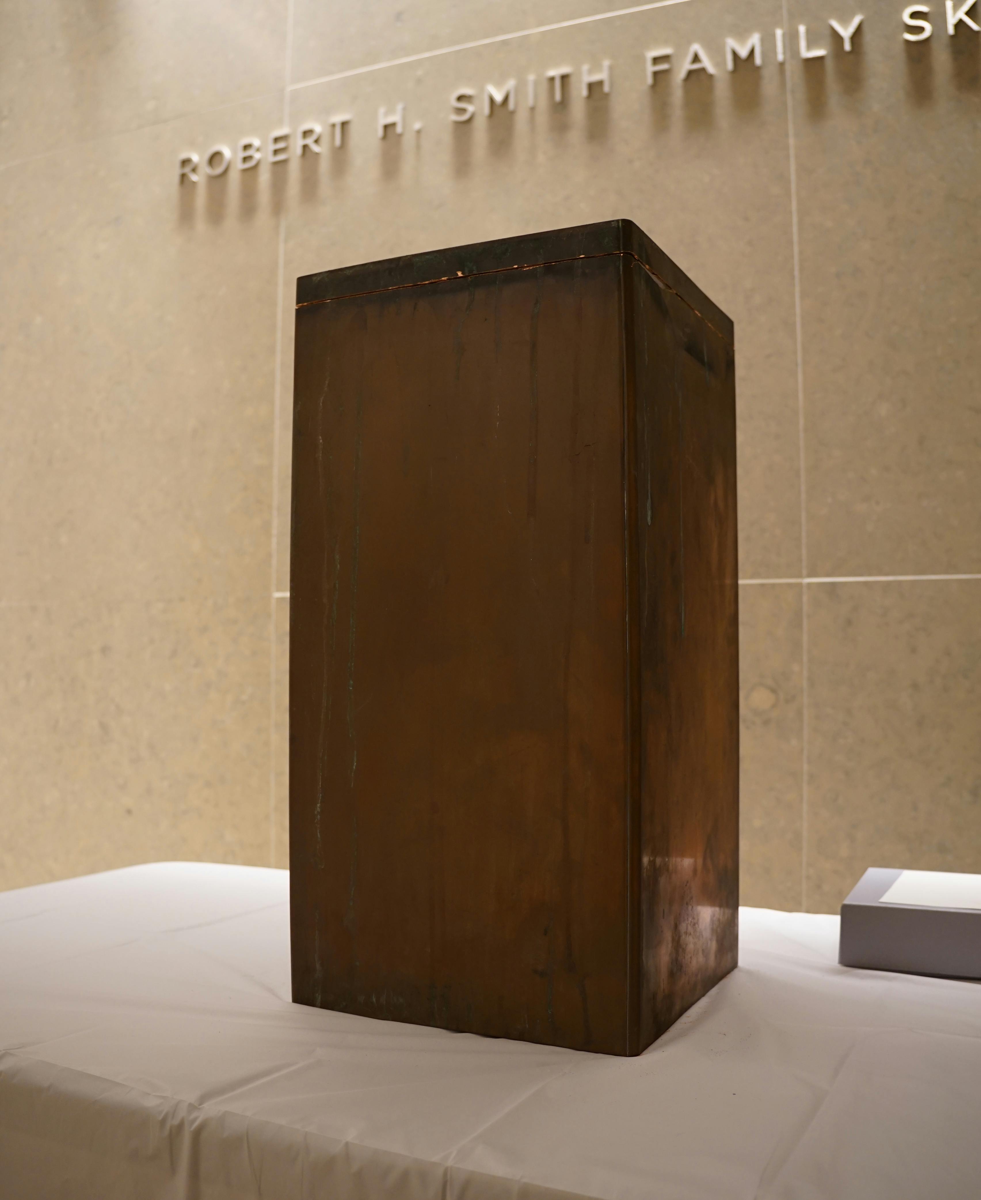 (Left) The original copper box that sat behind the Time-Life Building cornerstone for over 50 years; (right) the new chest created by New-York Historical (Photos: Anna Belle Peevey)