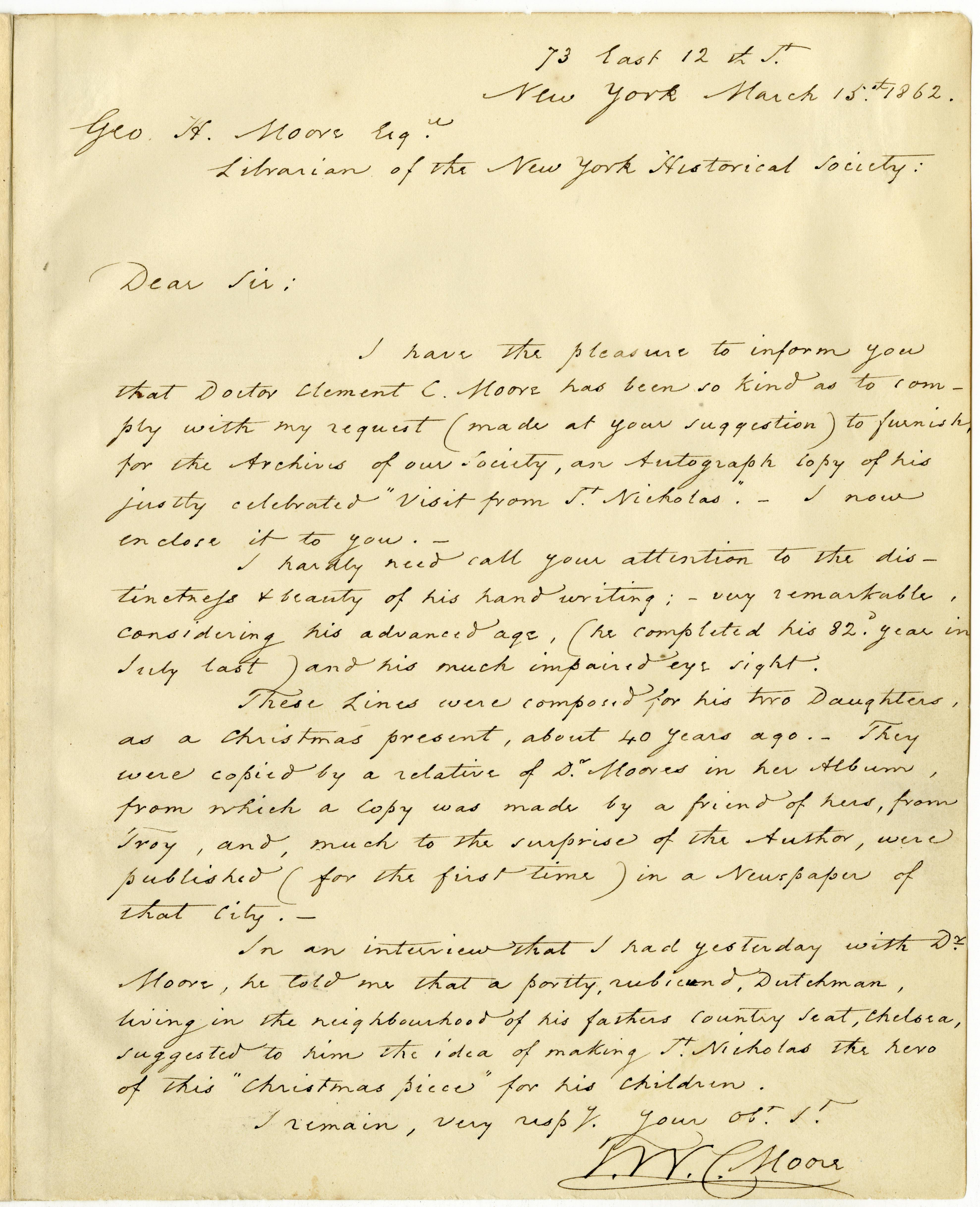 Letter from Thomas W.C. Moore, March 15, 1862, accompanying a manuscript in Clement Clarke Moore's hand of "A Visit from St. Nicholas." The Patricia D. Klingenstein Library, The New York Historical.