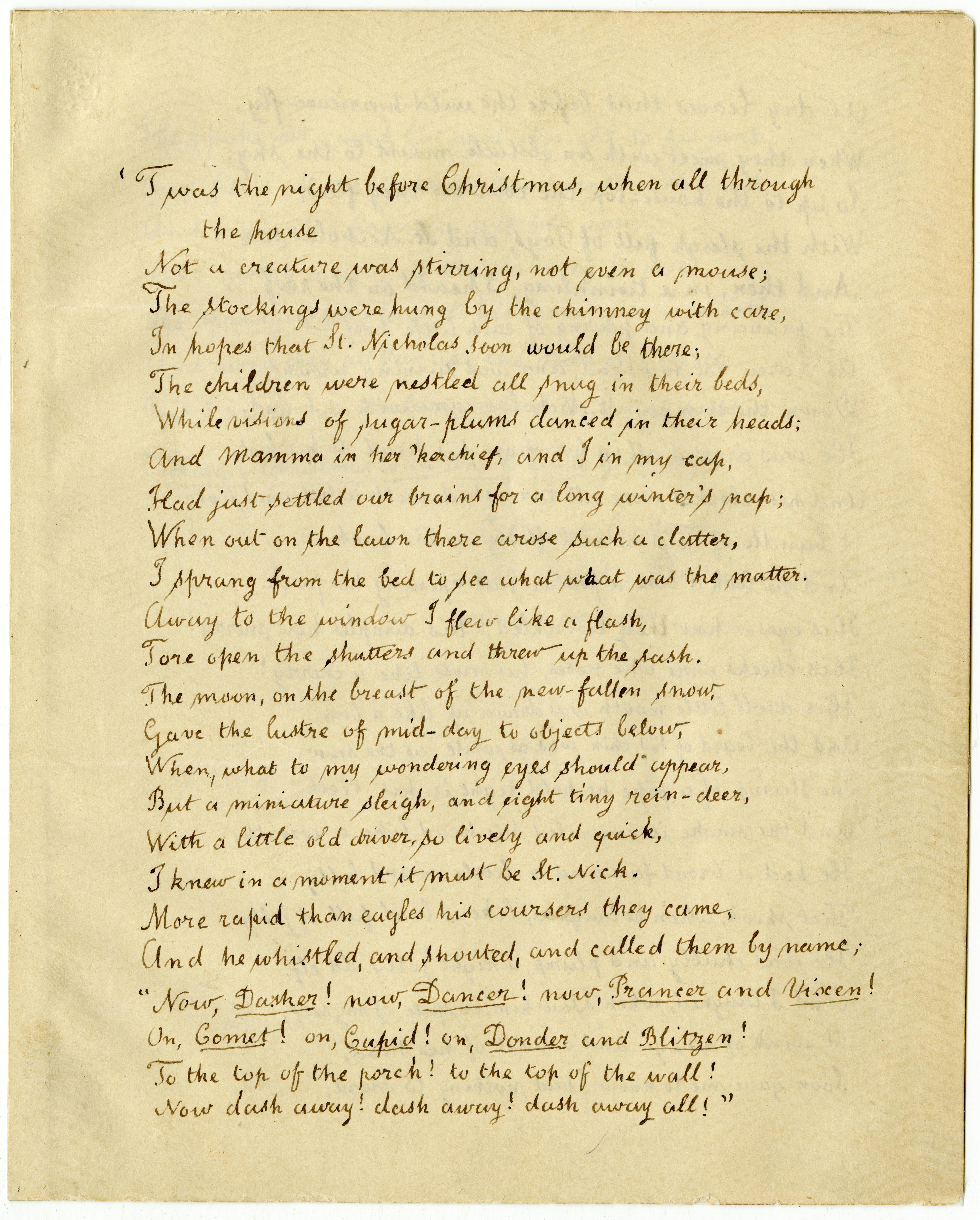 My daughter and I argued last night while reading "'Twas the Night Before Christmas.” Our conflict centered on whether Santa’s reindeer was called “Donner” (more familiar to us) or “Donder,” as it was printed in a new edition of the poem we'd recently acquired. What she didn’t know was that I had an unfair advantage in our dispute: I knew that I could double-check at least one manuscript written by Moore himself, because that manuscript is in the collection of the Patricia D. Klingenstein Library, here at The New York Historical.