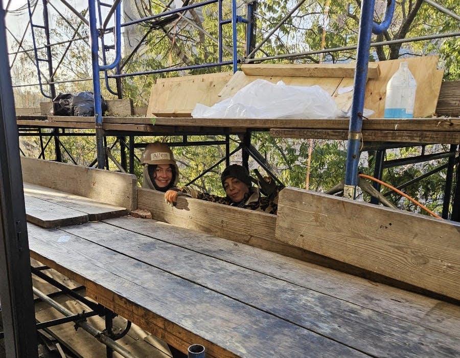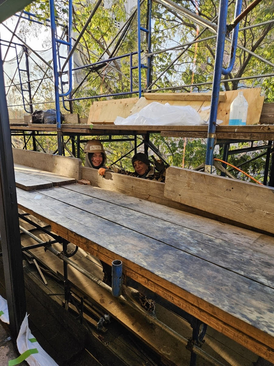 Two of Allen Architectural Metal's finishers, Nora King and Samantha Kupfer, on scaffolding around the New-York Historical Society building.