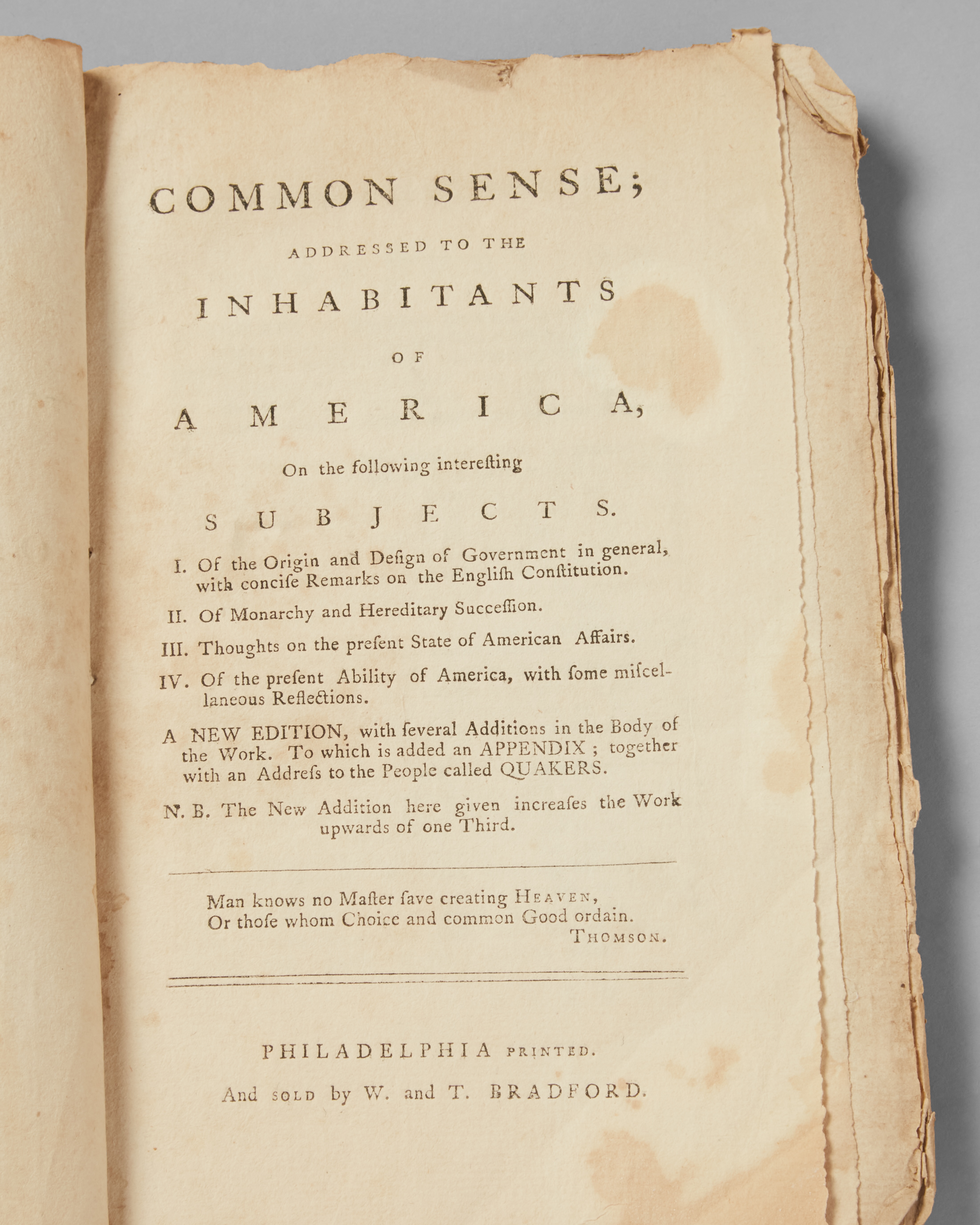![Thomas Paine, Common Sense; Addressed to the Inhabitants of America [. . .] (Philadelphia: Bradford, 1776). Photograph by Vincent Dilio. Courtesy of David M. Rubenstein.](https://d17xep5pb0e8k3.cloudfront.net/aJSvs6Tt2nPbZ9qc_16-06112025_common_sense_thomas_paine_philadelphia_1776_C_165b.jpg?auto=format,compress&w=2000&h=2500&q=80)
