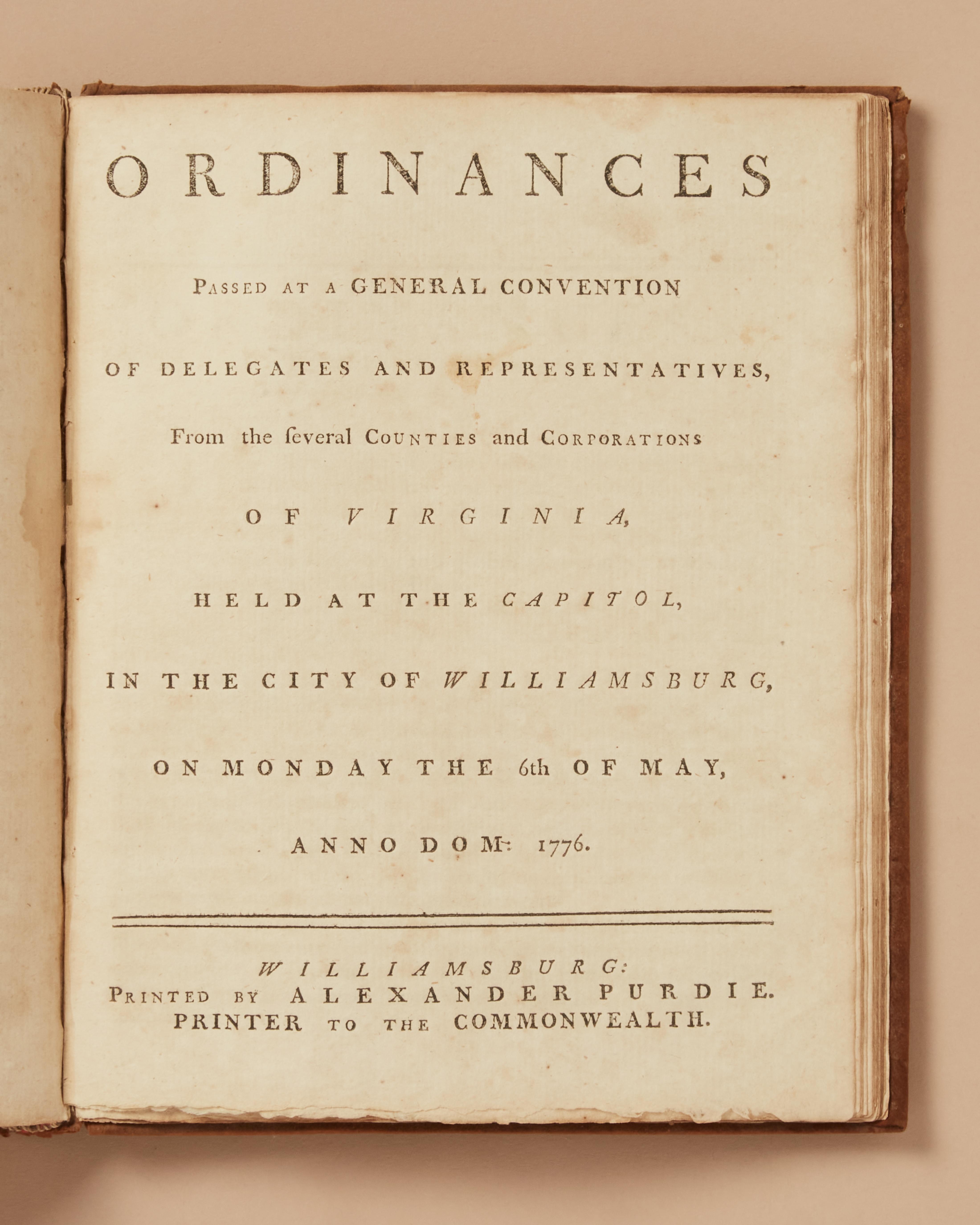 ![George Mason, [The Virginia Declaration of Rights] [in:] The Proceedings of the Convention of Delegates, Held [. . .] In the City of Williamsburg (Williamsburg: Purdie, 1776). Photograph by Vincent Dilio. Courtesy of David M. Rubenstein.](/_next/image?url=https%3A%2F%2Fd17xep5pb0e8k3.cloudfront.net%2FaJUJfqTt2nPbZ-uQ_11-04092025_virginia_proceedings_and_ordinances_williamsburg_1776_C_159.jpg%3Fauto%3Dformat%2Ccompress%26w%3D2000%26h%3D2500%26q%3D80&w=1200&q=75)
