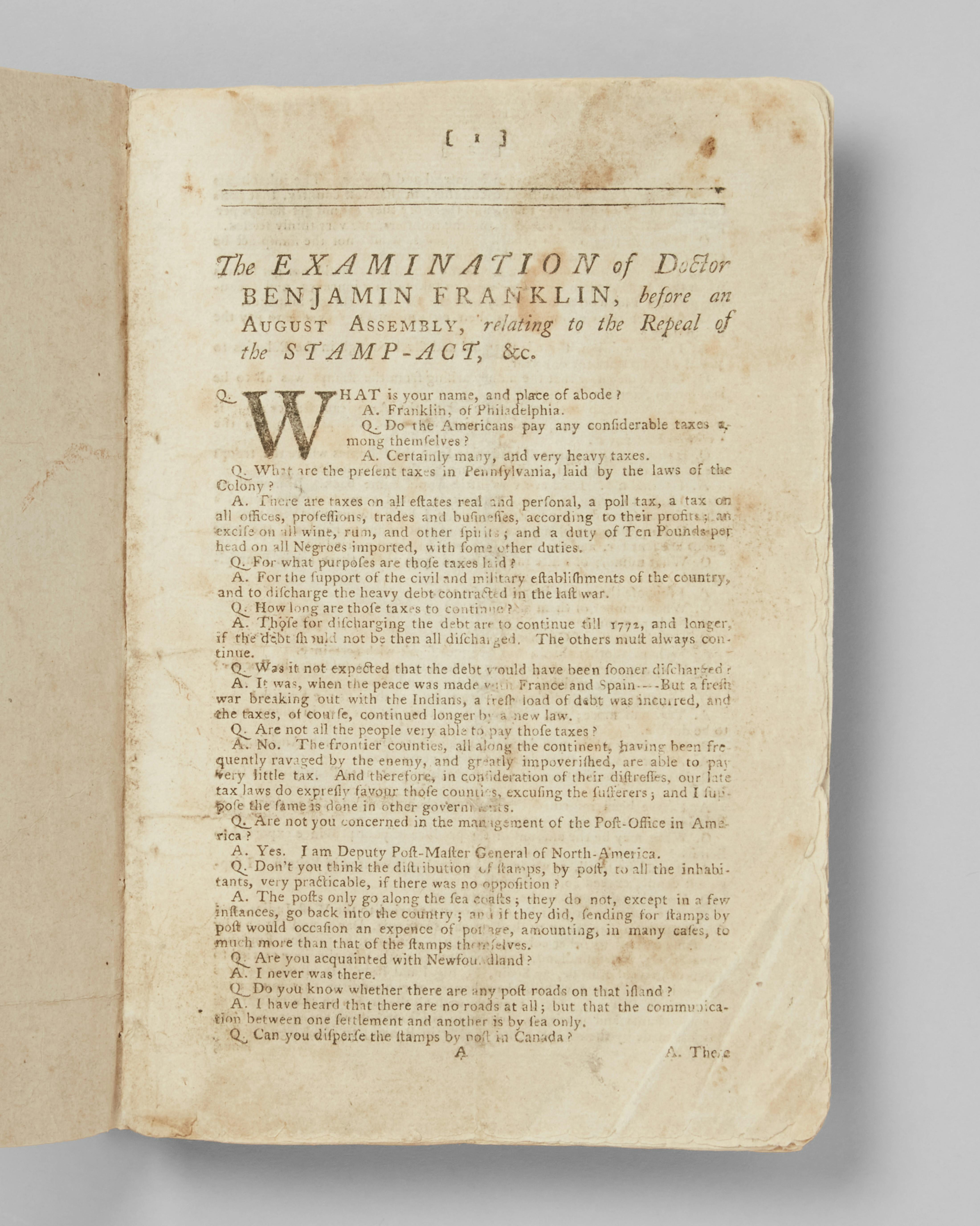 ![Benjamin Franklin, The Examination of Doctor Benjamin Franklin, before an August Assembly [. . .] (Philadelphia: Hall and Sellers, 1766). Photograph by Vincent Dilio. Courtesy of David M. Rubenstein.](https://d17xep5pb0e8k3.cloudfront.net/aJSvX6Tt2nPbZ9qN_04-03182025_franklin_examined_by_parliament_1766_B_306B.jpg?auto=format,compress&w=2000&h=2500&q=80)