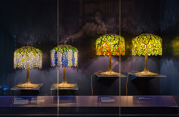As the centerpiece of the 4th floor, the Gallery of Tiffany Lamps features 100 illuminated Tiffany lamps from our spectacular collection, displayed within a dramatically lit jewel-like space. Regarded as one of the world’s largest and most encyclopedic, the Museum’s Tiffany Lamp collection includes multiple examples of the Dragonfly shade, a unique Dogwood floor lamp (ca. 1900–06), a Wisteria table lamp (ca. 1901), and a rare, elaborate Cobweb shade on a Narcissus mosaic base (ca. 1902), among many others.